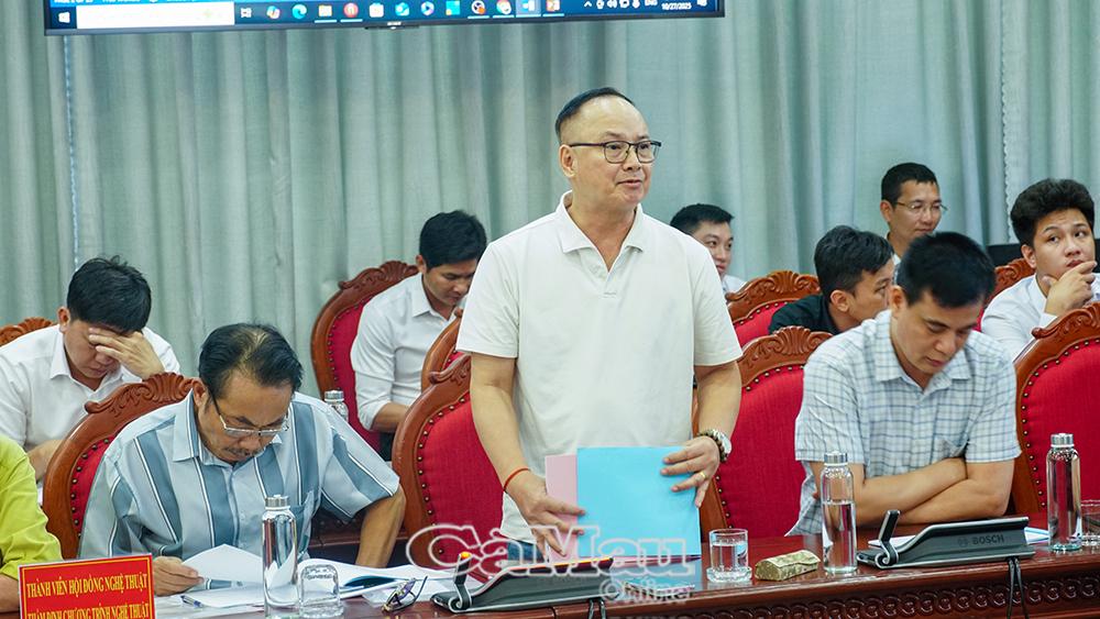 Tổng đạo diễn chương trình Nghệ thuật khai mạc Ngày hội Cua Cà Mau lần II/2025, NSND Nguyễn Minh Thông phát biểu tại cuộc họp.