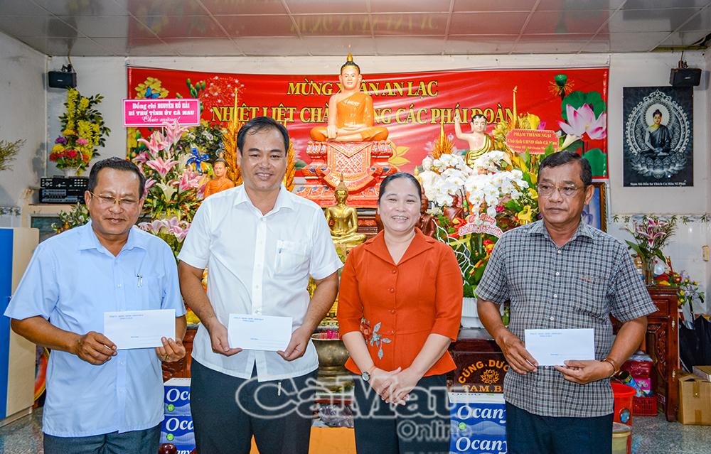 Đồng chí Nguyễn Thu Tư, Giám đốc Sở Dân tộc và Tôn giáo tỉnh, tặng quà Ban quản trị Chùa Monivongsa Bopharam.