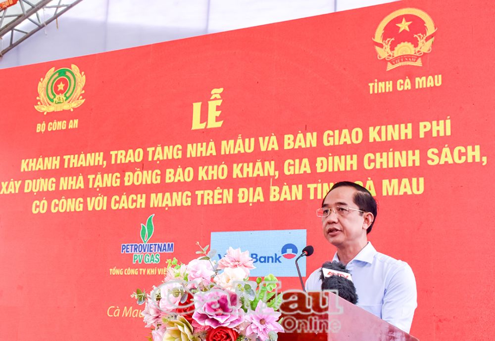 Phát biểu tại buổi lễ, đồng chí Hồ Thanh Thuỷ, Phó Bí thư Tỉnh uỷ, Chủ tịch Uỷ ban MTTQ Việt Nam tỉnh Cà Mau, bày tỏ sự tri ân, ghi nhận tình cảm, sự hỗ trợ quý báu của Bộ Công an và các đơn vị tài trợ.