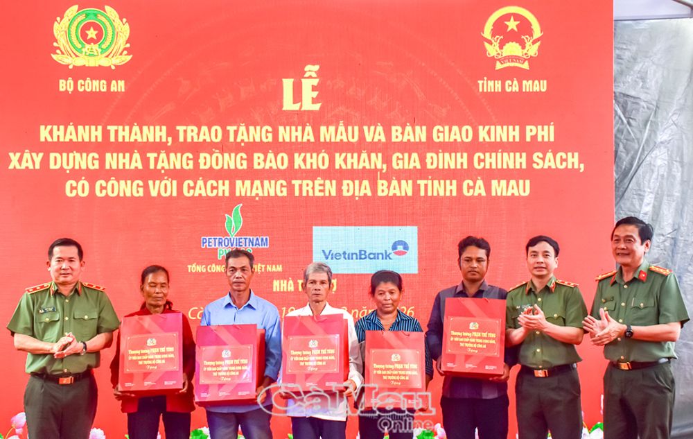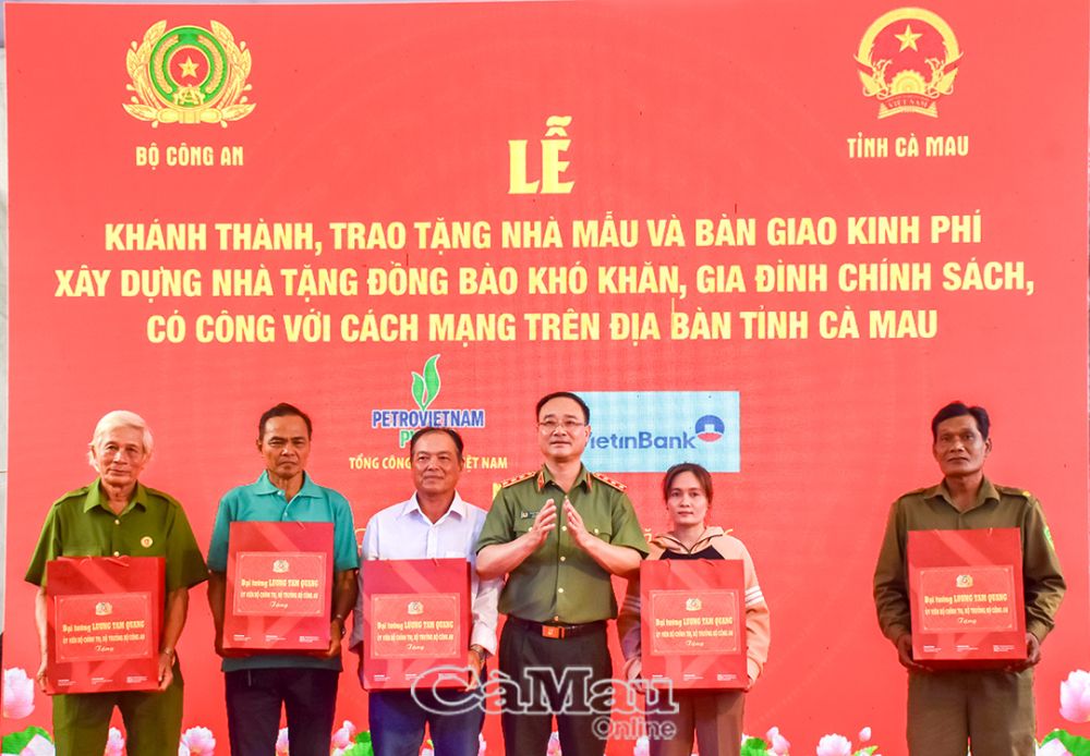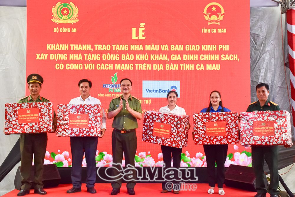 Bên cạnh bàn giao kinh phí xây dựng nhà, dịp này, Bộ trưởng Bộ Công an tặng 20 suất quà và Thứ trưởng Bộ Công an tặng 20 suất quà cho các hộ gia đình chính sách, hộ khó khăn trên địa bàn các xã: Thới Bình, Đá Bạc, Trí Phải, Trần Văn Thời.