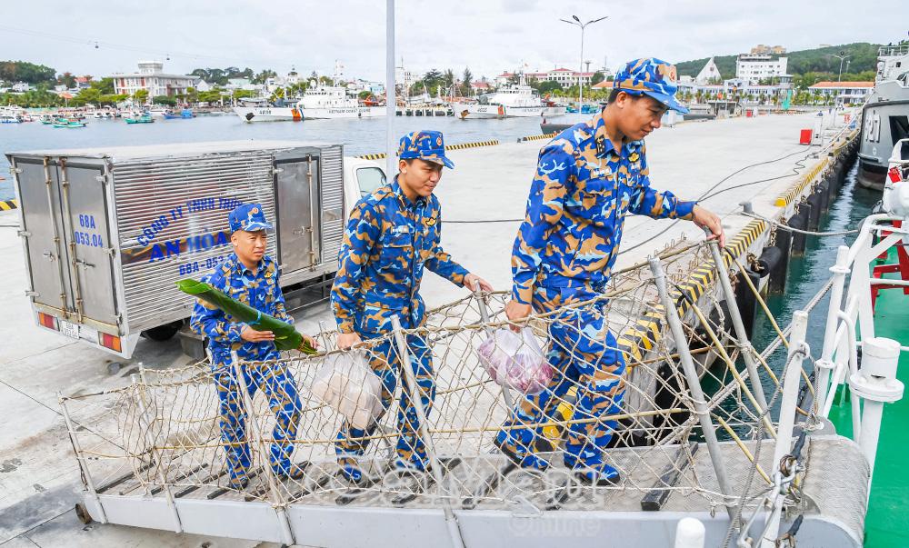 Cán bộ, chiến sĩ Tàu 924 chuyển thực phẩm lên tàu chuẩn bị thực hiện nhiệm vụ.