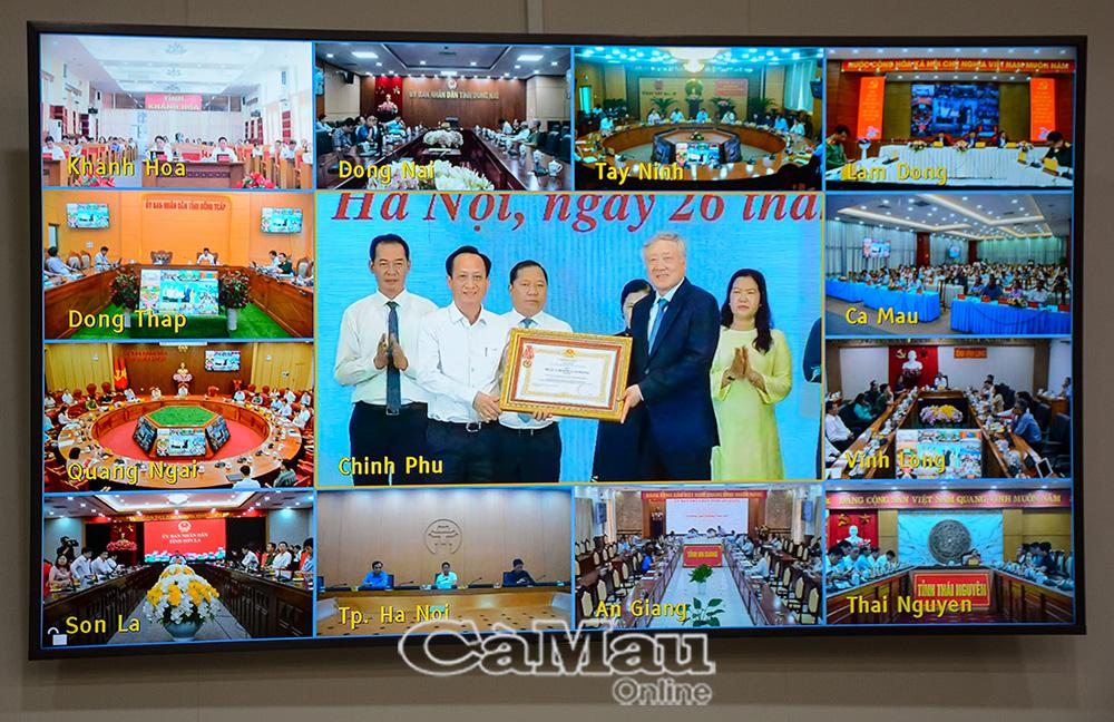 Tỉnh Cà Mau là 1 trong 19 tập thể được Thủ tướng Chính phủ tặng Huân chương Lao động hạng Ba vì có thành tích xuất sắc trong Phong trào “Chung tay xóa nhà tạm, nhà dột nát” trên phạm vi cả nước. (Ảnh chụp từ màn hình: Đồng chí Nguyễn Hòa Bình, Uỷ viên Bộ Chính trị, Phó Thủ tướng Thường trực Chính phủ trao Huân chương Lao động hạng Ba cho đại diện lãnh đạo tỉnh Cà Mau).