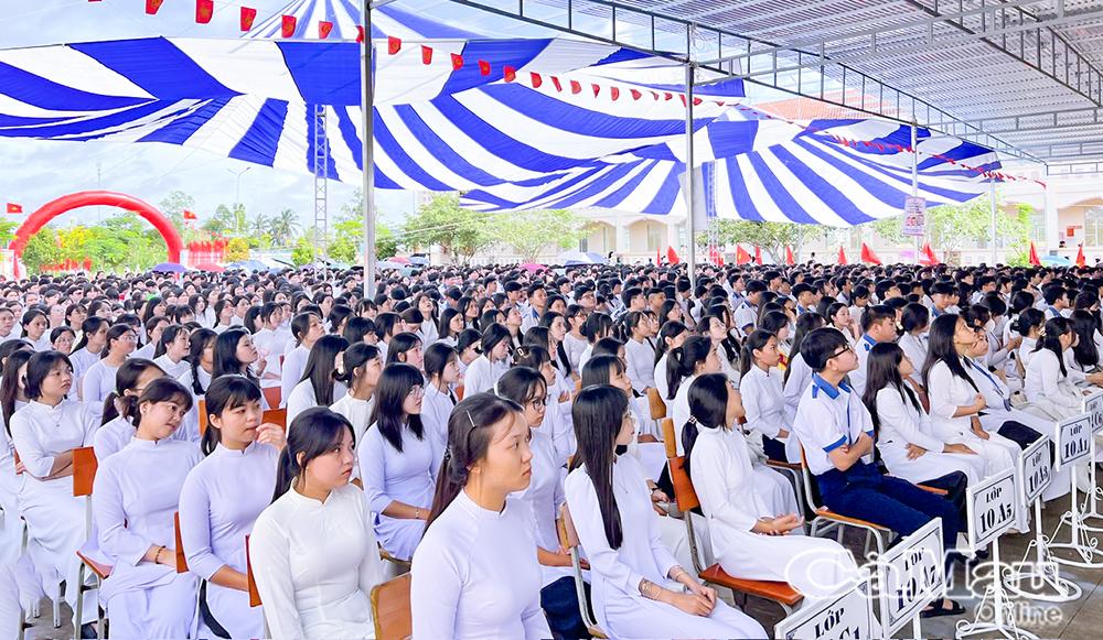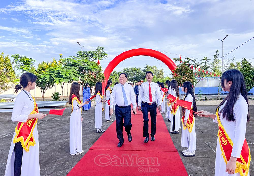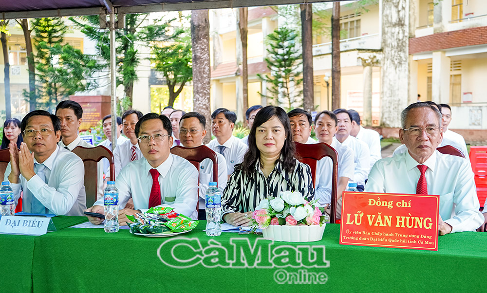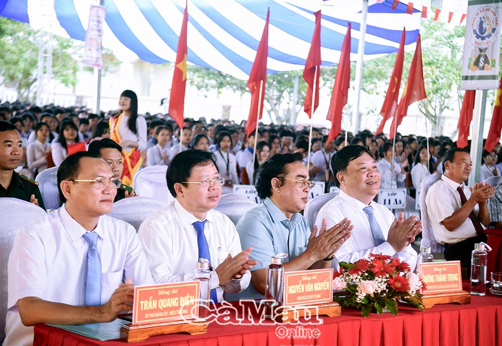 Đồng chí Lữ Văn Hùng, Uỷ viên BCH Trung ương Đảng, Trưởng đoàn Đại biểu Quốc hội tỉnh Cà Mau (bìa phải) dự Lễ khai giảng năm học mới tại Trường THPT chuyên Phan Ngọc Hiển.