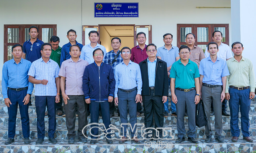 Đoàn công tác tỉnh Cà Mau chụp ảnh lưu niệm với cán bộ Trung tâm Dịch vụ Kỹ thuật nông - lâm nghiệp, trực thuộc Sở Nông nghiệp và Lâm nghiệp tỉnh Bo ly khăm xay.