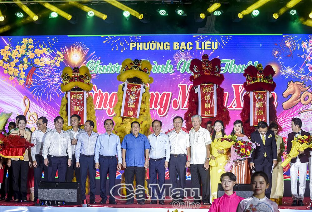 Lãnh đạo tỉnh và phường Bạc Liêu tặng hoa tri ân các nghệ sĩ, diễn viên tham gia biểu diễn tại chương trình.