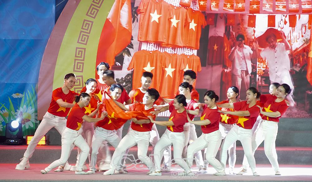 Các nghệ sĩ trong trang phục màu cờ đỏ sao vàng biểu diễn tiết mục múa mang nội dung ca ngợi Đảng, lan toả khí thế hào hùng, thiêng liêng và niềm tự hào sâu sắc.