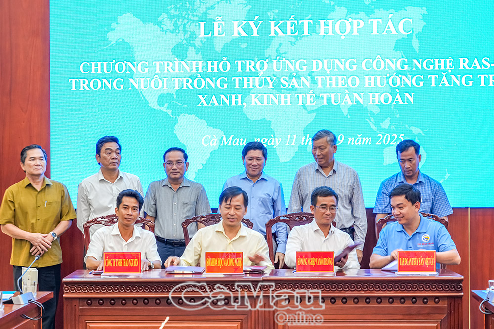 Sáng 11/9, UBND tỉnh Cà Mau tổ chức Hội nghị ký kết thoả thuận hợp tác triển khai nhân rộng mô hình nuôi tôm thẻ chân trắng siêu thâm canh công nghệ RAS-IMTA với quy mô 1.500 ha, do Phó Chủ tịch UBND tỉnh Lê Văn Sử chủ trì. Tham dự có TS. Nguyễn Nhứt, Viện Nghiên cứu Nuôi trồng thuỷ sản II, cùng đại diện các sở, ngành, ngân hàng và doanh nghiệp.
