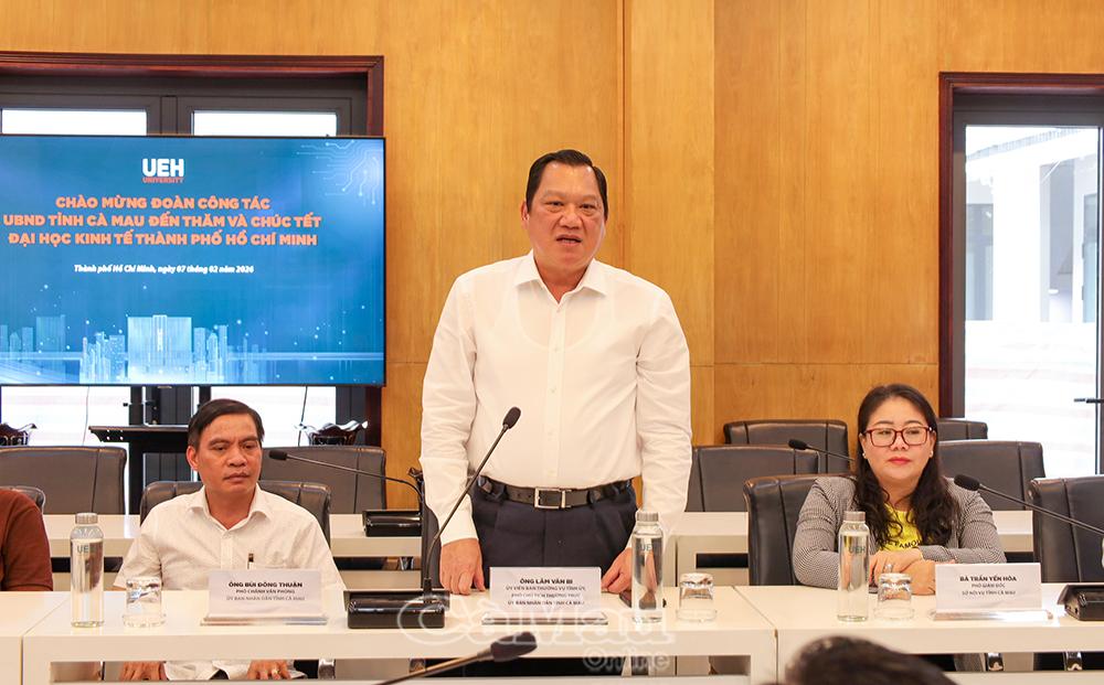 Tại buổi gặp gỡ, Phó Chủ tịch Thường trực UBND tỉnh Cà Mau Lâm Văn Bi gửi lời chúc mừng năm mới an khang, thịnh vượng đến Ban Giám đốc cùng toàn thể nhà trường; đồng thời ghi nhận, đánh giá cao những đóng góp quan trọng của UEH trong công tác đào tạo nguồn nhân lực chất lượng cao, thúc đẩy đổi mới sáng tạo, nghiên cứu khoa học và tư vấn chính sách phát triển kinh tế - xã hội cho nhiều địa phương, trong đó có tỉnh Cà Mau.
