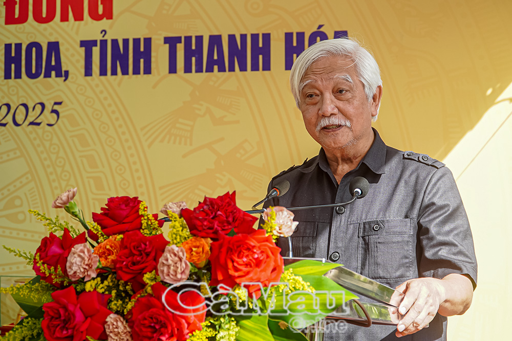 Đồng chí Phạm Văn Thiều, Phó Bí thư Tỉnh uỷ, Chủ tịch HĐND tỉnh Cà Mau, phát biểu nhấn mạnh tầm quan trọng và sự gắn kết giữa Cà Mau - Thanh Hoá trong buổi lễ tiếp nhận trống đồng.