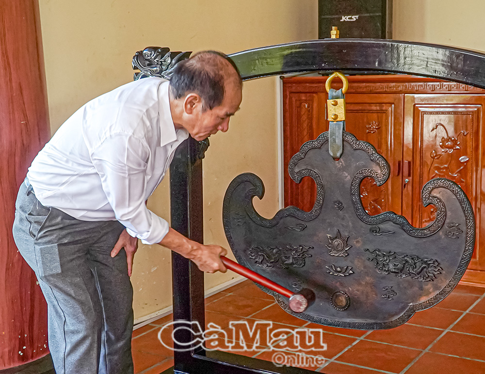 Ông Hồ Quang Sơ, Uỷ viên Ban Chấp hành Trung ương Hội Di sản Văn hoá Việt Nam, Chủ tịch Hội Di sản Văn hoá và Cổ vật Thanh Hoa, gõ khánh tại gian thờ Bác Hồ.