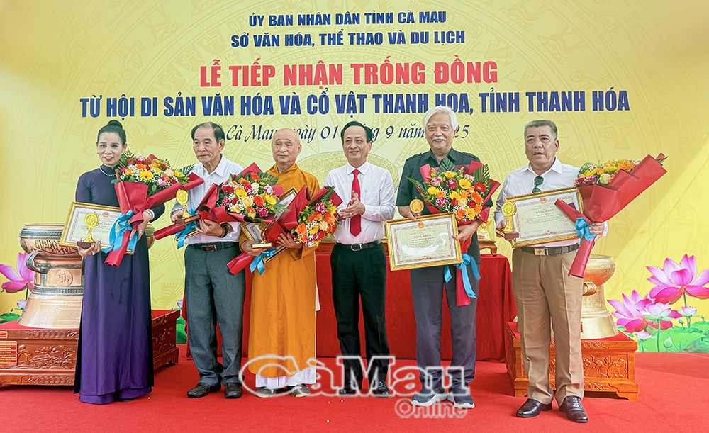 Đồng chí Nguyễn Quốc Thanh, Giám đốc Sở Văn hoá - Thể thao và Du lịch tỉnh Cà Mau, trao giấy khen cho 1 tập thể và 29 cá nhân có thành tích xuất sắc trong việc tham gia đúc, trao tặng và vận chuyển trống đồng.