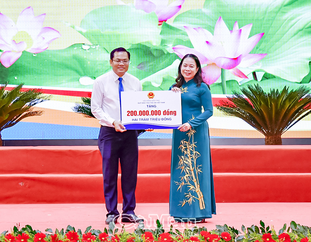 Phó Chủ tịch nước Võ Thị Ánh Xuân trao tặng số tiền 200 triệu đồng cho trẻ em có hoàn cảnh khó khăn vươn lên trong học tập tại tỉnh Cà Mau.