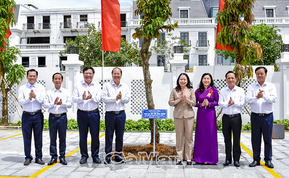 Sau đại hội, Phó Chủ tịch nước Võ Thị Ánh Xuân trồng cây và chụp ảnh lưu niệm với các đồng chí Thường trực Tỉnh uỷ.