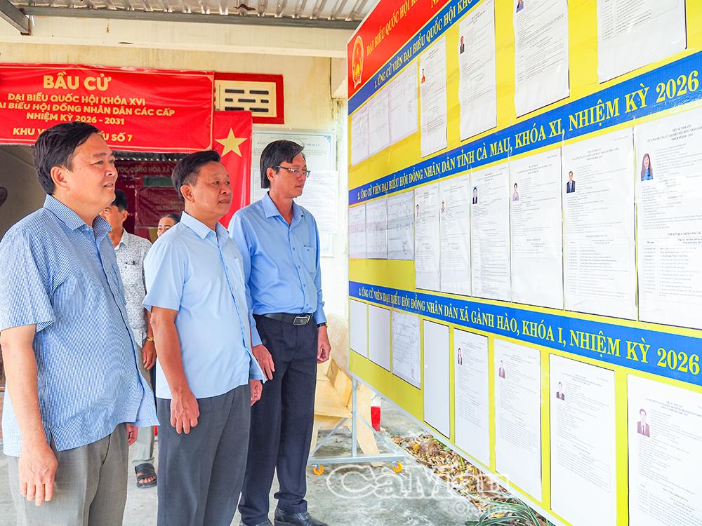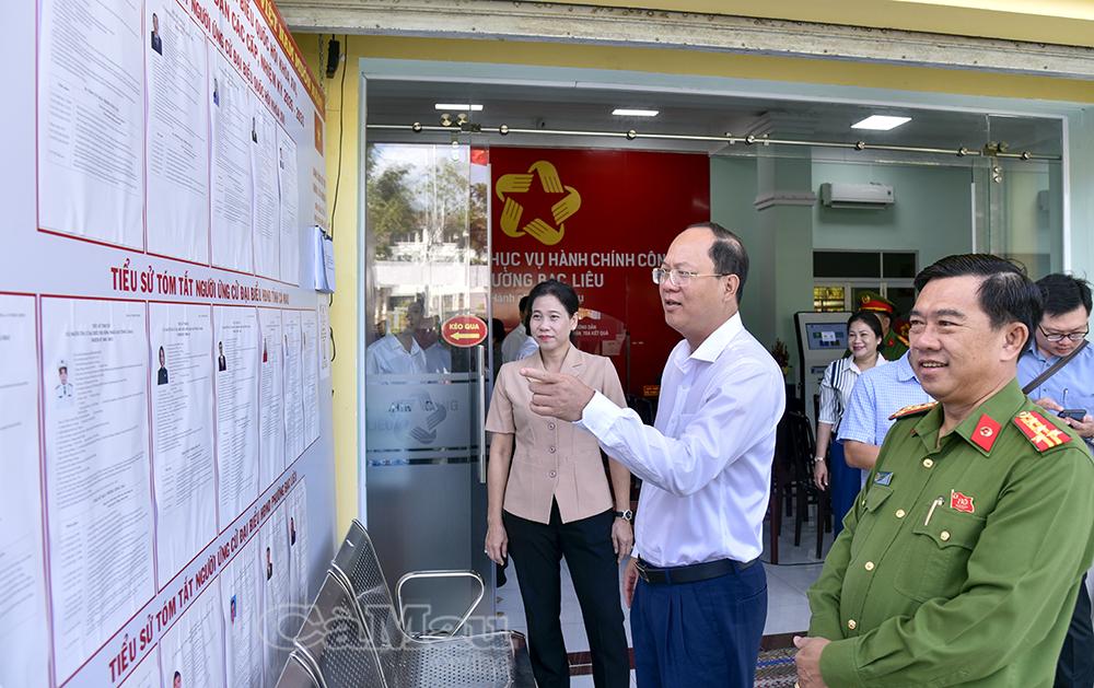 Bí thư Tỉnh uỷ Nguyễn Hồ Hải (giữa) kiểm tra khu vực bố trí danh sách người ứng cử tại Khu vực bỏ phiếu số 5 (phường Bạc Liêu).