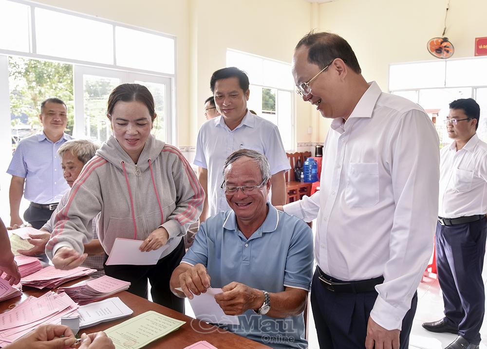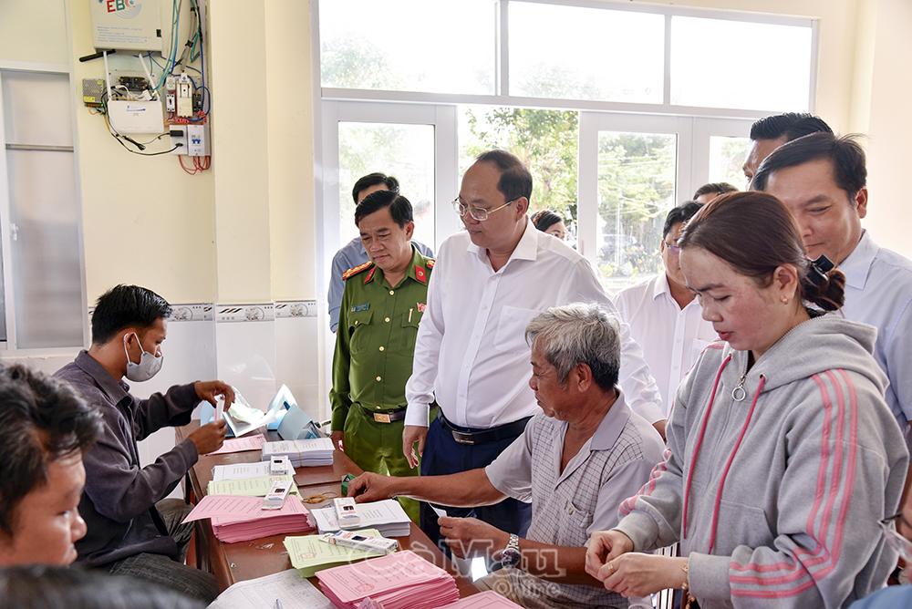 Trưởng Ban Tuyên giáo và Dân vận Tỉnh uỷ Hồ Trung Việt (giữa) kiểm tra bầu cử tại ấp Lam Điền, xã Gành Hào.