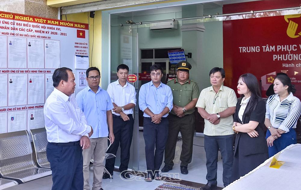 Đoàn công tác kiểm tra Khu vực bỏ phiếu số 5, phường Bạc Liêu - 1 trong 5 điểm được chọn truyền hình trực tiếp lễ khai mạc Ngày hội bầu cử của tỉnh vào sáng 15/3; đồng thời kiểm tra đột xuất Khu vực bỏ phiếu số 13, phường Vĩnh Trạch.
