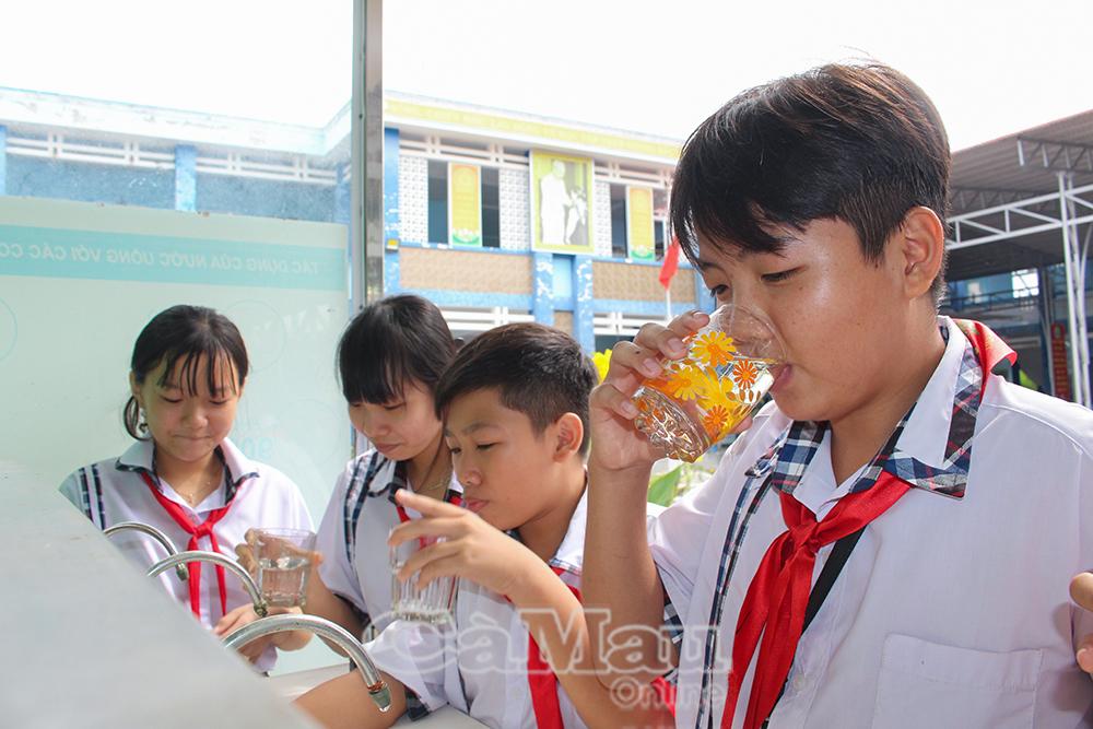 Hệ thống máy lọc đã giúp các em học sinh Trường THCS Nguyễn Trung, xã Thới Bình tiếp cận được với nguồn nước ngọt, hợp vệ sinh.