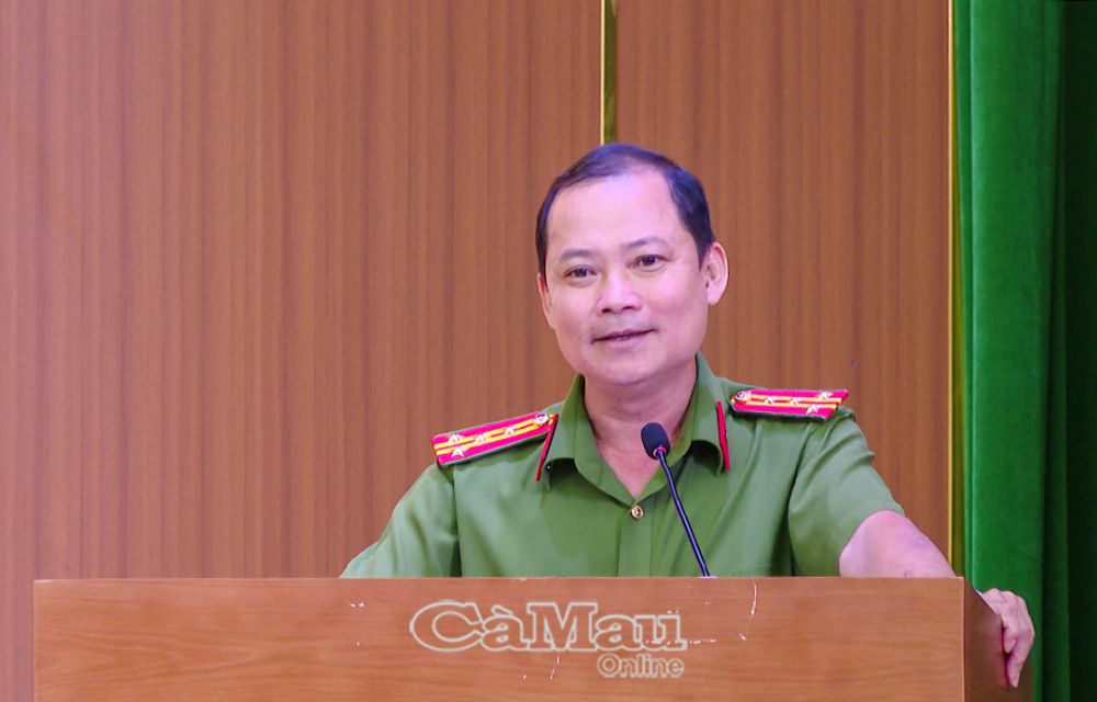 Đại tá Trần Văn Thi, Phó Giám đốc Công an tỉnh Cà Mau, phát biểu tại hội nghị.