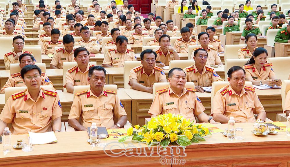 Lãnh đạo Công an tỉnh Cà Mau cùng cán bộ, chiến sĩ CSGT tham dự hội nghị.