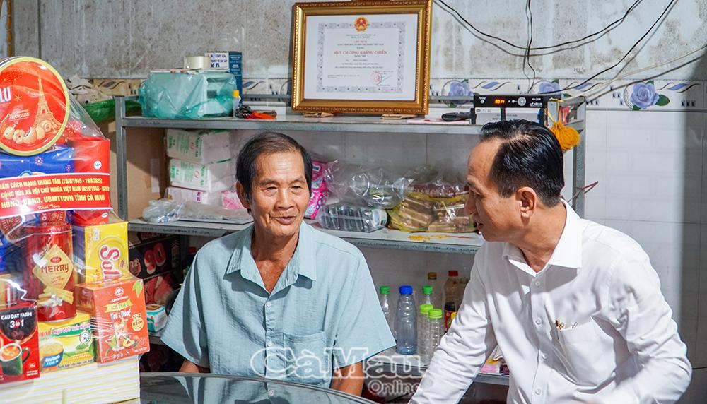 Chủ tịch HĐND tỉnh Phạm Văn Thiều (bìa phải) ân cần thăm hỏi sức khoẻ Thương binh Trần Thanh Hột.