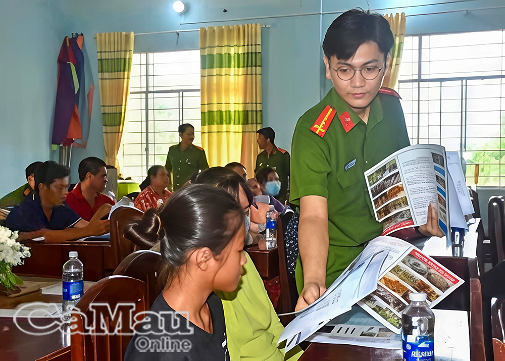 Công an xã Vĩnh Lợi phát tờ rơi tuyên truyền người dân chấp hành nghiêm các quy định pháp luật, không chế tạo, sản xuất, mua bán, vận chuyển, tàng trữ, sử dụng trái phép vũ khí, vật liệu nổ, công cụ hỗ trợ và pháo.