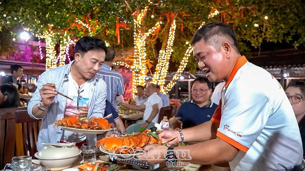 Du khách hào hứng thưởng thức món ngon từ cua Cà Mau.