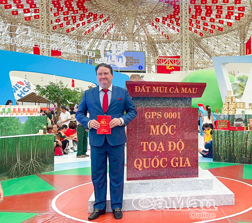 Ông Marc E. Knapper chụp ảnh lưu niệm tại mô hình Mốc tọa độ quốc gia Đất Mũi kèm theo lời hứa “sẽ đến Cà Mau trong thời gian gần nhất.