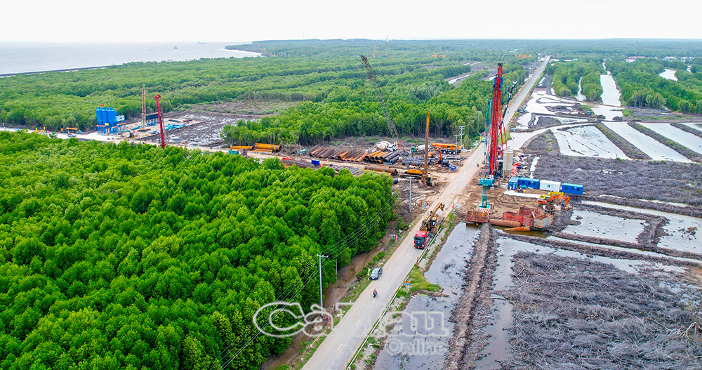 Điểm cuối cao tốc Cà Mau - Đất Mũi, đồng thời là điểm đầu cầu vượt biển ra Hòn Khoai, đang được đẩy nhanh tiến độ thi công.