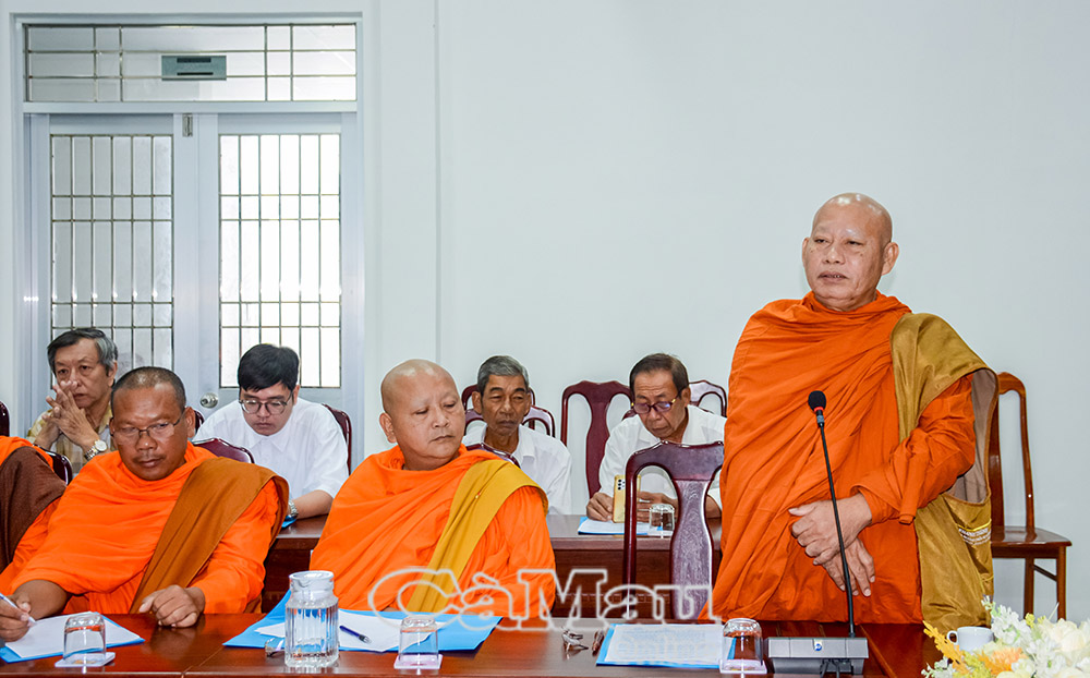 Hoà thượng Tăng Sa Vong, Phó Hội trưởng Hội Đoàn kết sư sãi yêu nước tỉnh, phát biểu đóng góp ý kiến nhằm nâng cao hiệu quả dạy chữ Khmer.