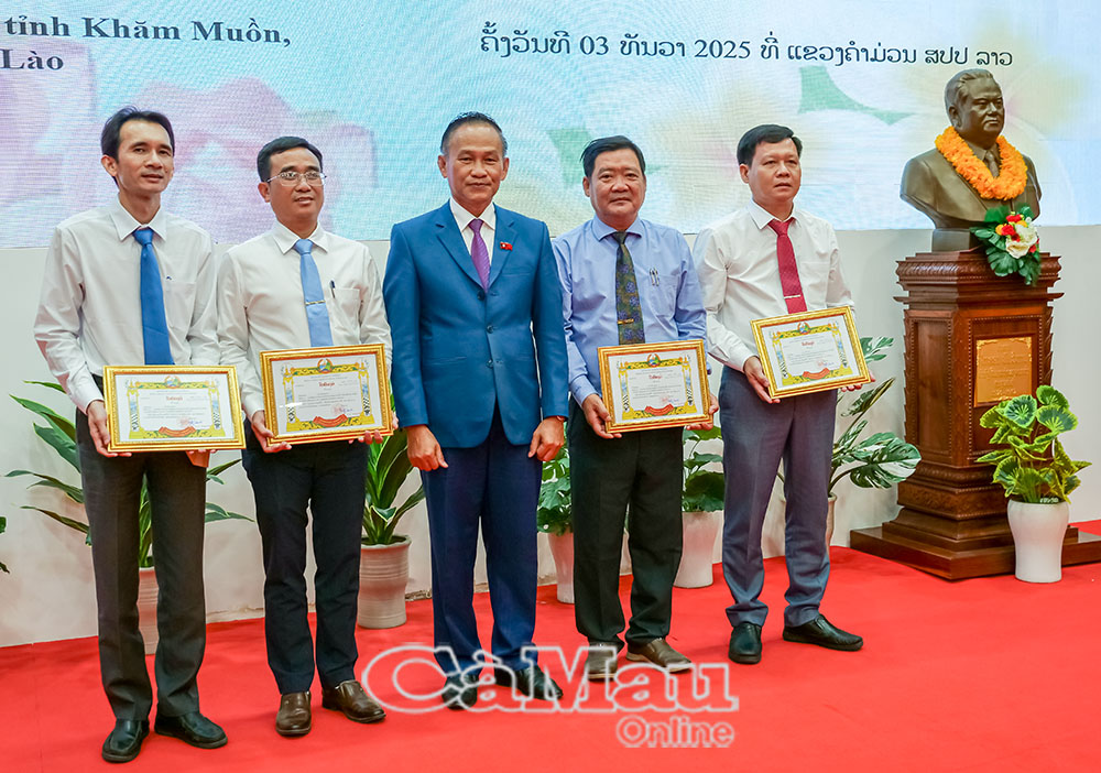Cán bộ tỉnh Cà Mau nhận bằng khen của tỉnh Khăm Muộn.