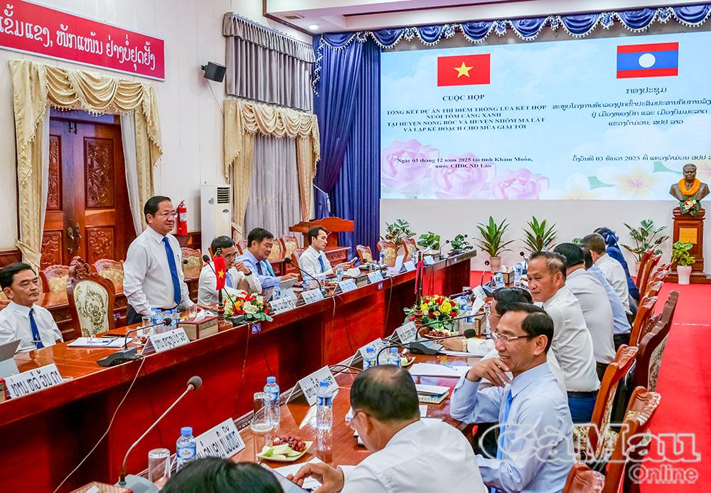 Trong khuôn khổ chuyến thăm và làm việc tại nước Cộng hoà Dân chủ Nhân dân Lào, chiều 3/12, đoàn cán bộ tỉnh Cà Mau do đồng chí Lê Thanh Triều, Uỷ viên Ban Thường vụ Tỉnh uỷ, Phó Chủ tịch Thường trực Uỷ ban MTTQ Việt Nam tỉnh Cà Mau làm trưởng đoàn, có buổi làm việc với lãnh đạo tỉnh Khăm Muồn về vấn đề hợp tác giữa hai tỉnh thời gian qua.