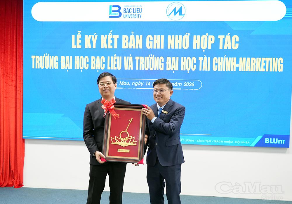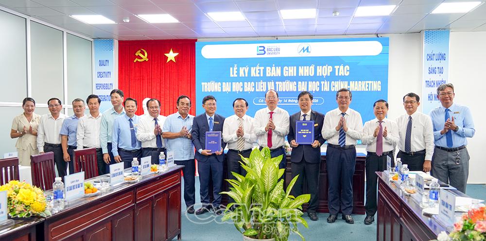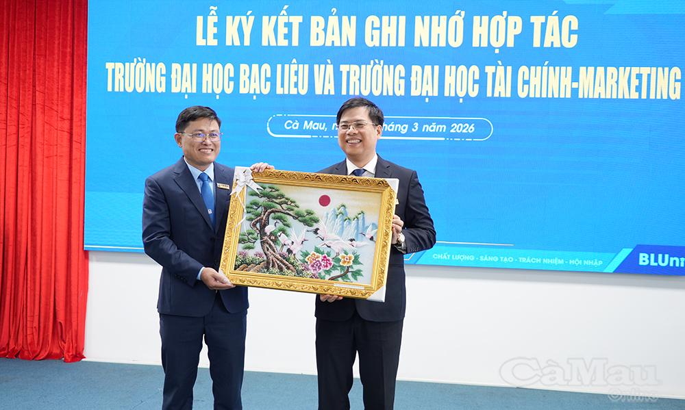 Lãnh đạo Trường Đại học Bạc Liêu và Trường Đại học Tài chính - Marketing trao biên bản ghi nhớ.