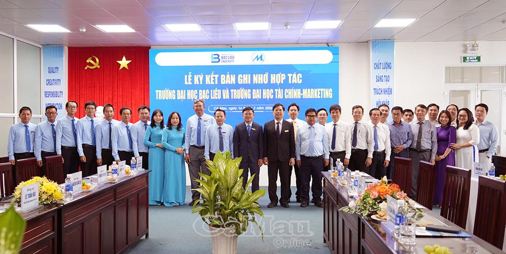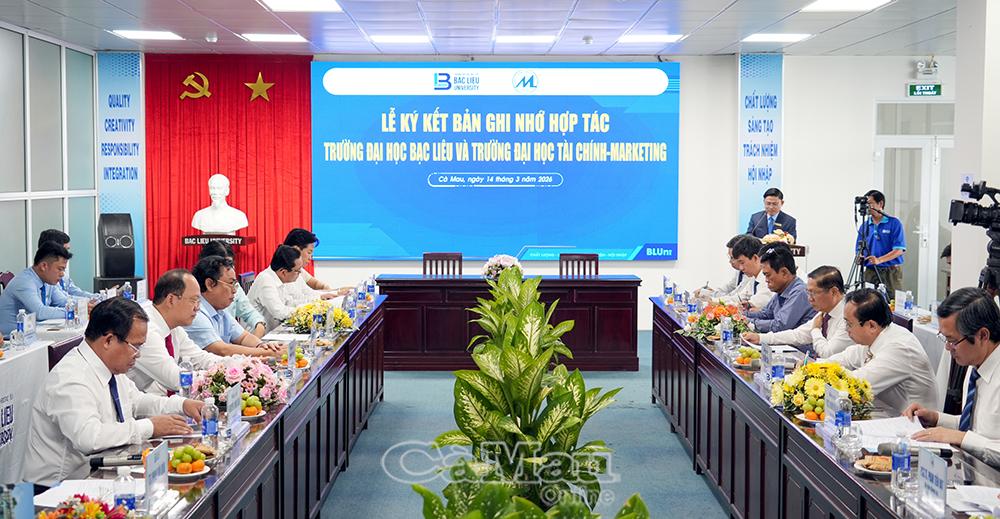 Lãnh đạo Trường Đại học Bạc Liêu và Trường Đại học Tài chính - Marketing tiến hành ký kết bản ghi nhớ hợp tác chiến lược trước sự chứng kiến của lãnh đạo bộ, ngành, địa phương.