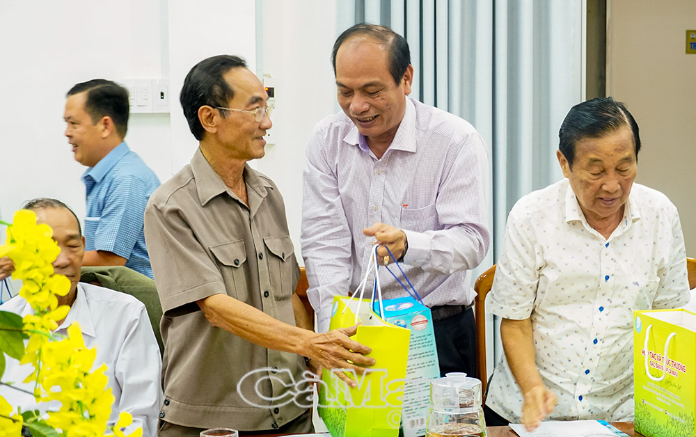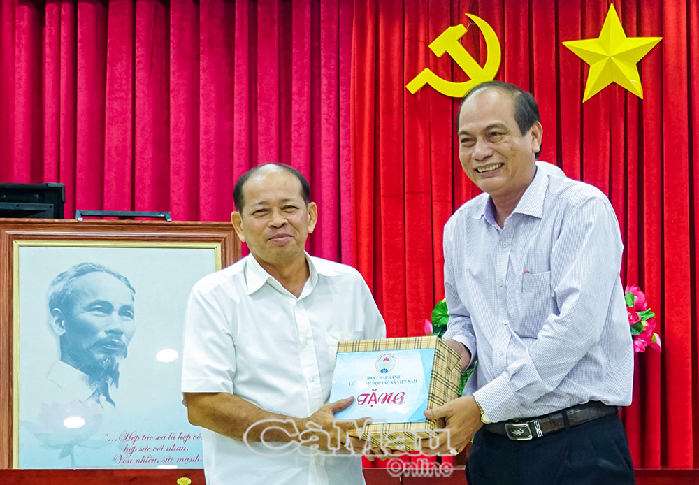 Ông Nguyễn Văn Vũ, Chủ tịch Liên minh HTX tỉnh Cà Mau tặng quà cho nguyên lãnh đạo Liên minh HTX hai tỉnh Cà Mau và Bạc Liêu (cũ).