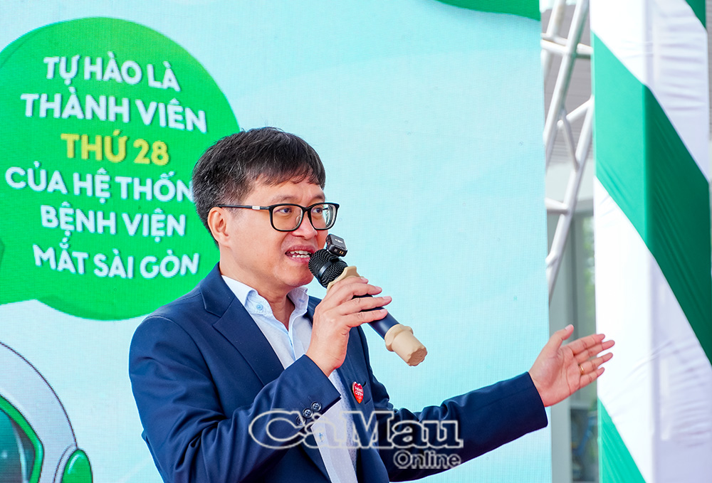 Bác sĩ CK1 Diệp Văn Hon, Giám đốc điều hành Bệnh viện Mắt Sài Gòn Minh Hải, phát biểu tại lễ khánh thành.