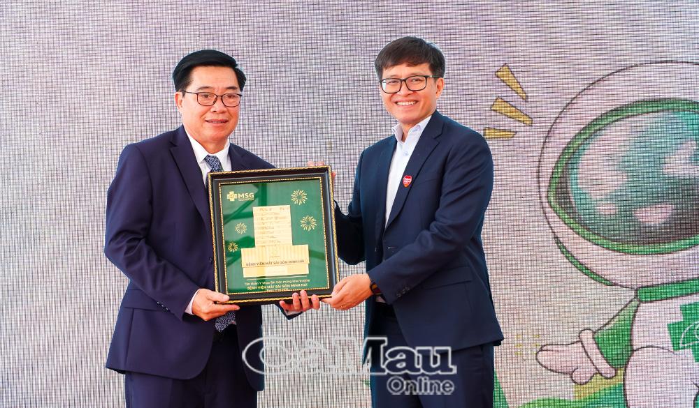 Ông Huỳnh Lê Đức, Tổng Giám đốc Tập đoàn Y khoa Sài Gòn, trao tặng Bệnh viện Mắt Sài Gòn Minh Hải bức khánh vàng - biểu tượng cho khởi đầu và khát vọng phát triển bền vững.