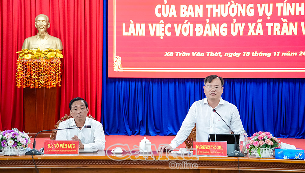 Tiếp thu ý kiến chỉ đạo, đồng chí Nguyễn Thế Châu, Bí thư Đảng uỷ xã Trần Văn Thời, cảm ơn tổ công tác và khẳng định Đảng uỷ xã sẽ cụ thể hoá các nội dung thành nhiệm vụ, giải pháp phù hợp với điều kiện thực tế; phát huy tinh thần đoàn kết, quyết tâm hoàn thành tốt các mục tiêu mà Nghị quyết của Bộ Chính trị và cấp trên đề ra.