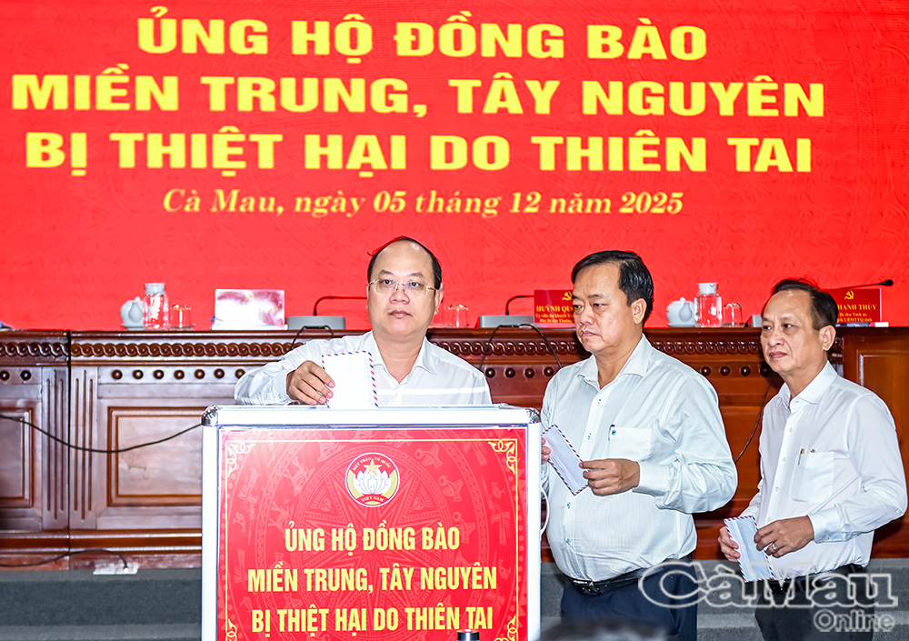 Trước khi tiến hành hội nghị, các đồng chí trong Ban Chấp hành Đảng bộ tỉnh Cà Mau quyên góp ủng hộ đồng bào miền Trung, Tây Nguyên bị thiệt hại do mưa lũ.