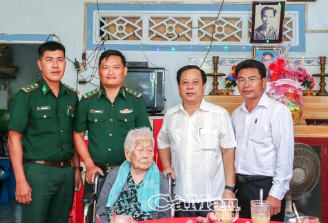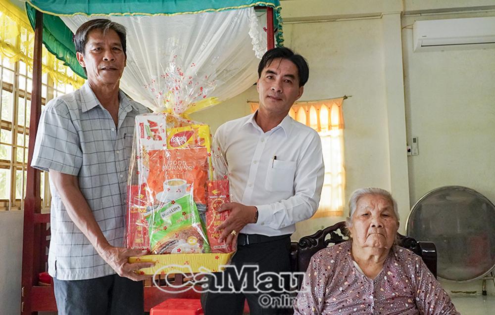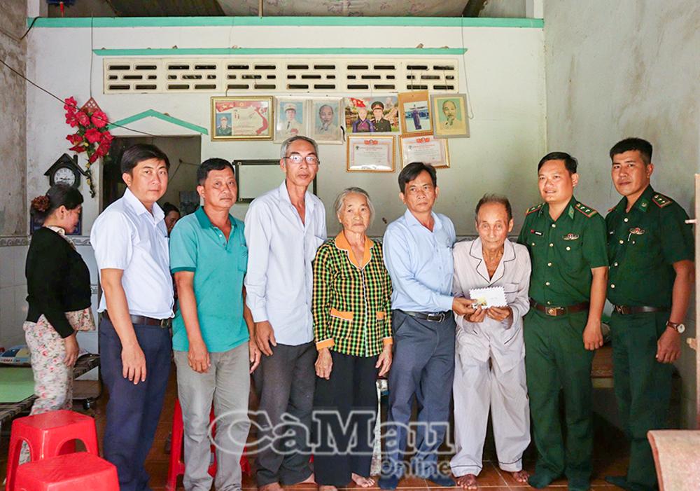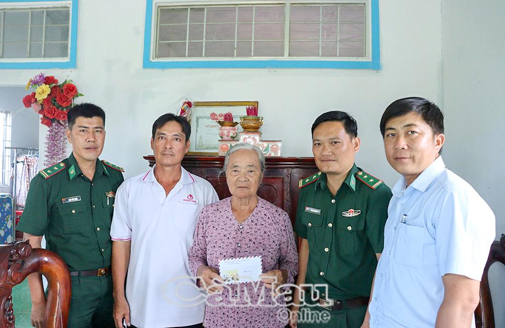 Bí thư Đảng uỷ xã Huỳnh Minh Nguyên (thứ 2 từ phải sang) cùng lãnh đạo Đồn Biên phòng và Ngân hàng Chính sách xã hội chi nhánh U Minh trao các phần quà tri ân đến Mẹ Việt Nam Anh hùng.