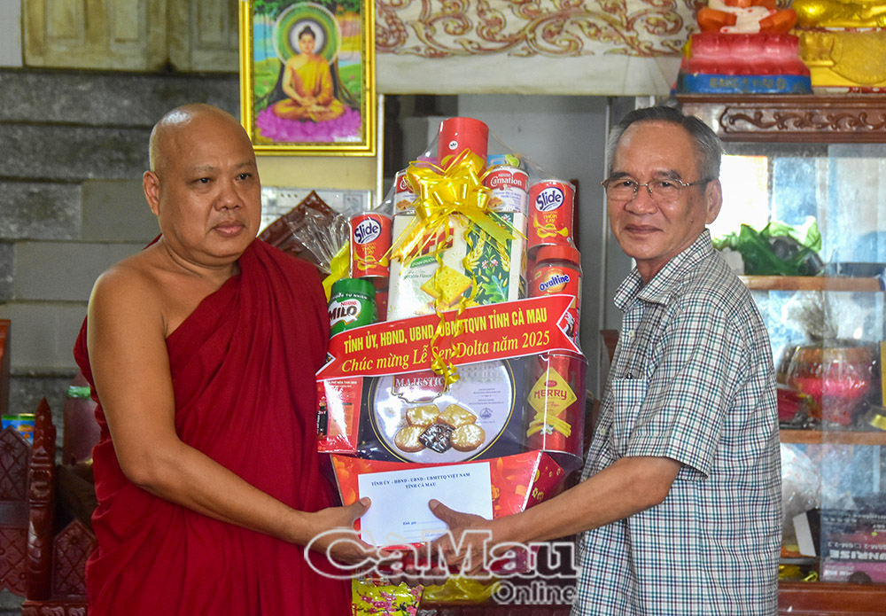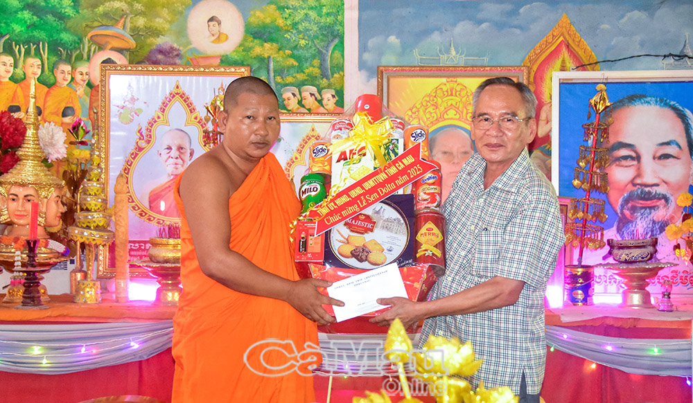 Đồng chí Bùi Tấn Bảy tặng phần quà cùng lời chúc mừng lễ Sene Dolta đến Thượng toạ Hồ Mít, trụ trì chùa Dì Quán (xã Ninh Quới).