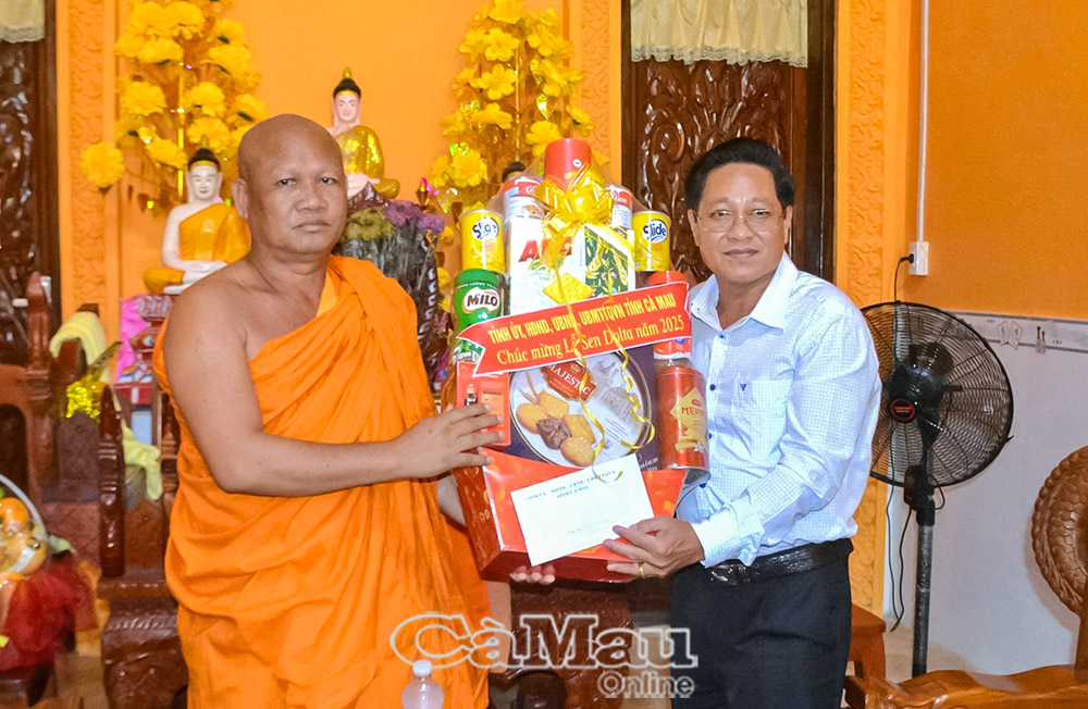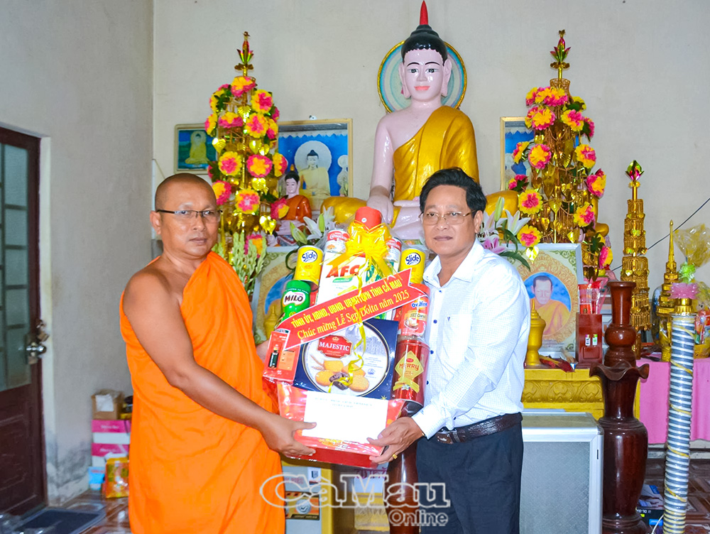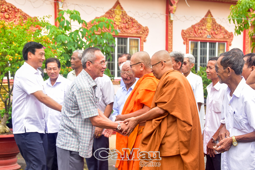 Đồng chí Bùi Tấn Bảy chúc mừng lễ Sene Dolta đến Phó trụ trì chùa Đầu Sấu (xã Hồng Dân).