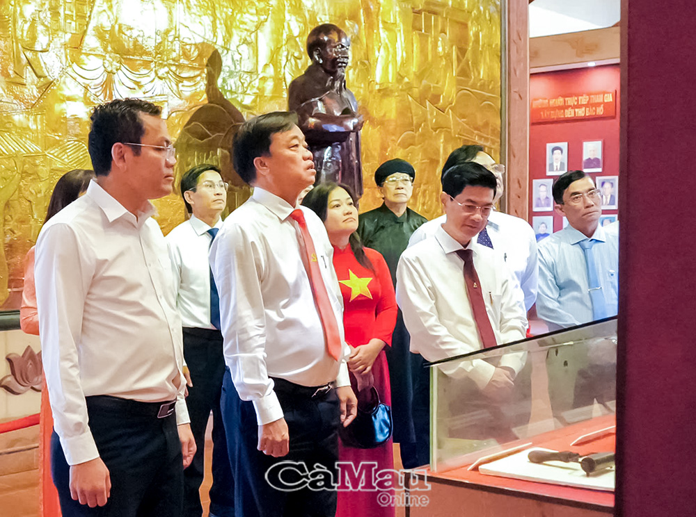 Phó Bí thư Thường trực Tỉnh uỷ Huỳnh Quốc Việt (thứ 2 từ trái sang) cùng lãnh đạo tỉnh tham quan Nhà trưng bày cuộc đời, sự nghiệp cách mạng của Chủ tịch Hồ Chí Minh.