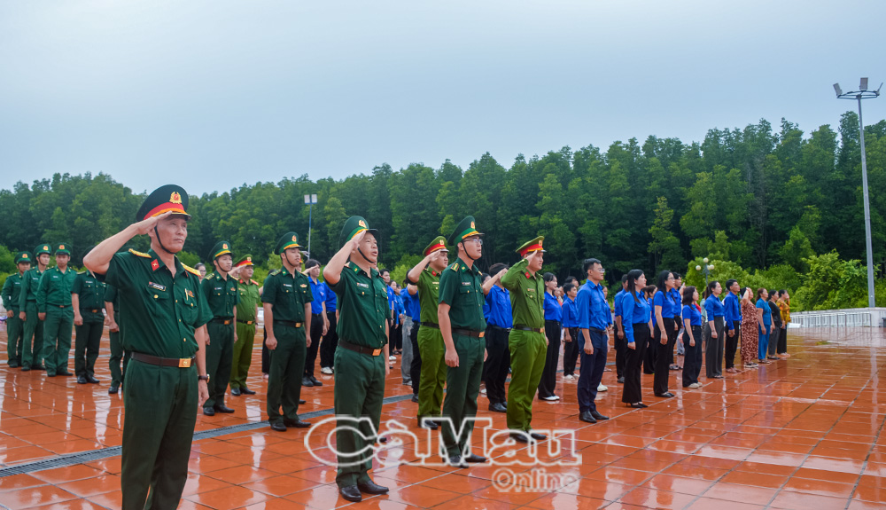 Trong không khí trang nghiêm tại Cột cờ Hà Nội tại Mũi Cà Mau, khẩu lệnh chào cờ và lời bài hát “Tiến quân ca” vang lên đầy tự hào, gợi nhắc những năm tháng đấu tranh gian khổ của quân và dân ta để giữ gìn độc lập, tự do. Hơn 150 đoàn viên, thanh niên và đông đảo du khách cùng hòa giọng hát, thể hiện quyết tâm tiếp nối truyền thống yêu nước của thế hệ cha anh.