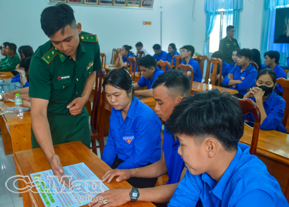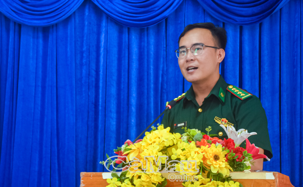 Đại uý Lương Văn Bình, Chính trị viên phó, Đồn Biên phòng Đất Mũi, trình bày chuyên đề về chủ quyền biển, đảo Việt Nam.