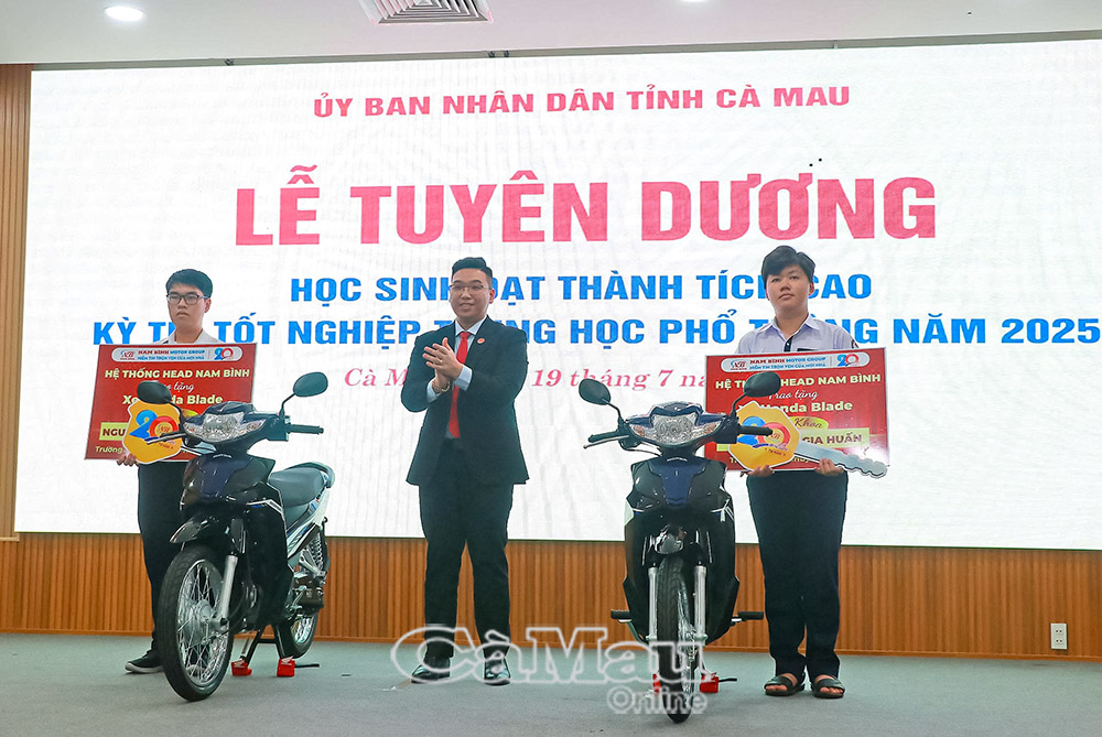 Dịp này, Công ty Nam Bình Motor Group trao tặng 2 xe Honda Wate Blade với tổng trị giá trên 42 triệu đồng cho 2 em học sinh đạt thành tích thủ khoa tại kỳ thi của 2 tỉnh Bạc Liêu (cũ) và Cà Mau (cũ).