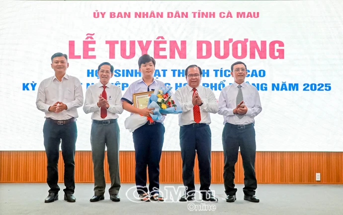 Em Nguyễn Ngọc Gia Bảo, Trường THPT Chuyên Phan Ngọc Hiển, Thủ khoa Kỳ thi tốt nghiệp THPT năm 2025 tỉnh Cà Mau (cũ) với tổng điểm 36,75, chia sẻ cảm xúc: “Em rất vui và xúc động khi được vinh danh hôm nay. Buổi lễ là nguồn động viên tinh thần lớn đối với em và các bạn được tuyên dương.”