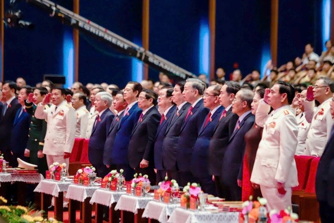Tổng Bí thư Tô Lâm nói đây là dịp để tri ân sâu sắc những cống hiến, những truyền thống vẻ vang lực lượng công an. Thay mặt lãnh đạo Đảng, Nhà nước, Tổng Bí thư chúc mừng và gắn Huân chương Sao Vàng lên cờ truyền thống của lực lượng công an nhân dân.