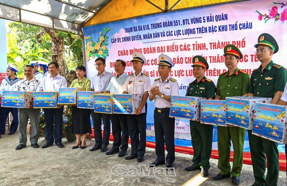 Đồng chí Bùi Minh Hải, Phó Chủ tịch Uỷ ban MTTQ Việt Nam tỉnh Cà Mau, trao quà Tết của tỉnh Cà Mau đến cán bộ, chiến sĩ trên quần đảo Thổ Chu.