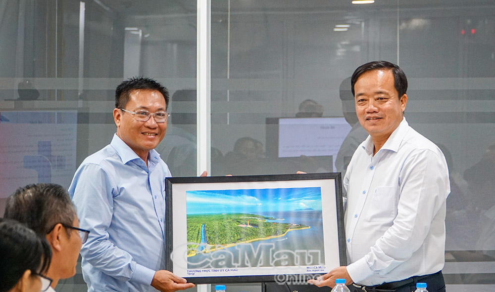 Dịp này, đồng chí Huỳnh Quốc Việt trao tặng Bệnh viện Đa khoa Hoàn Mỹ Minh Hải bức tranh Mũi Cà Mau làm quà lưu niệm và chụp ảnh lưu niệm với đội ngũ y bác sĩ.