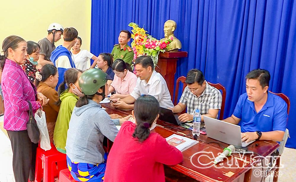 Cán bộ xã hướng dẫn người dân làm thủ tục nhận quà.